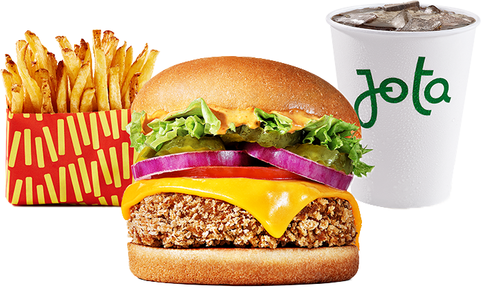 Hamburger crocante de grão de bico, pão finalizado na manteiga, queijo american cheese, alface, tomate, cebola roxa, picles e molho especial.